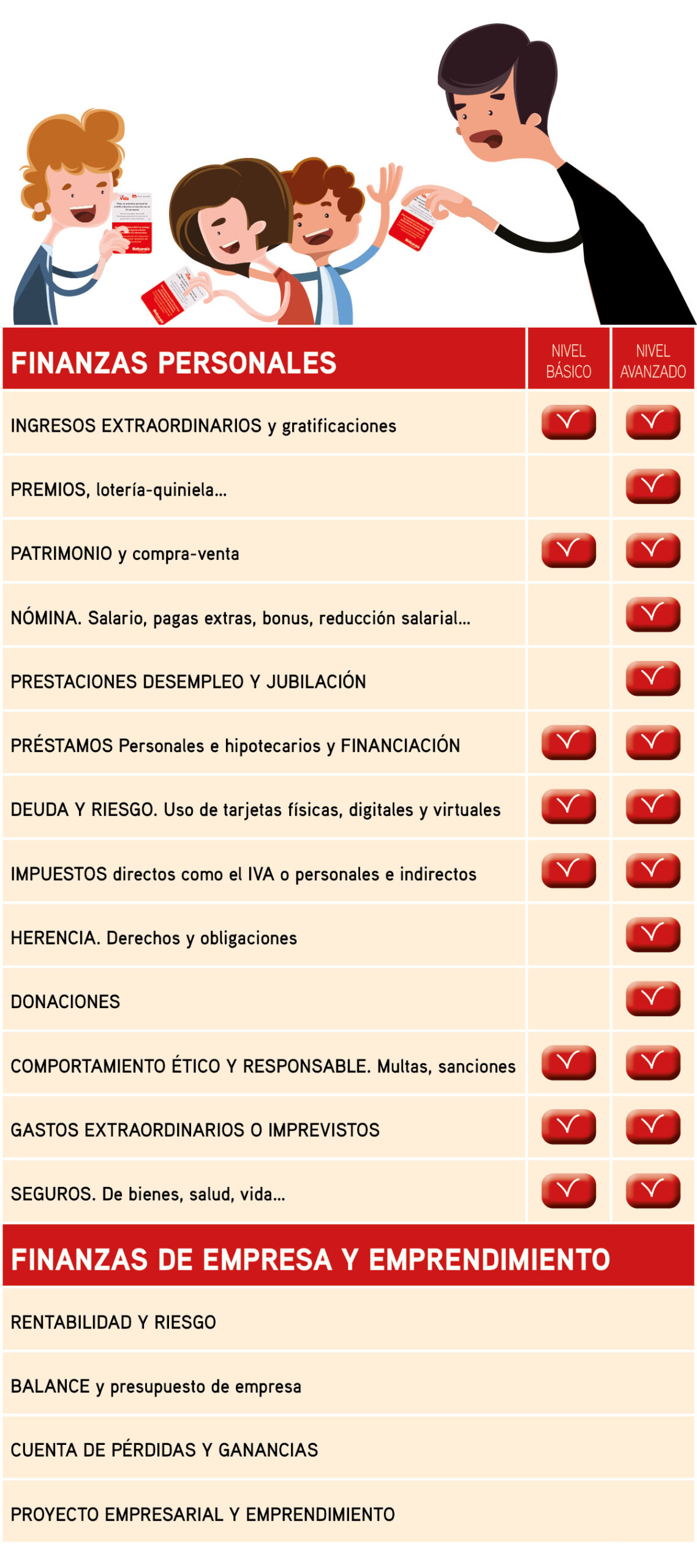 El juego de simulación Finanzas para la Vida cuenta con dos niveles dificultad. En el nivel básico se trabaja el presupuesto personal (ingresos y gastos) correspondiente a un/a joven estudiante; mientras en el nivel avanzado hay 13 personajes diferentes y realidades financieras distintas que permite adquirir un mayor grado de conocimiento. Además, ofrece la posibilidad de trabajar la cultura emprendedora y las finanzas de la empresa introduciendo un personaje de empresa (Startup).